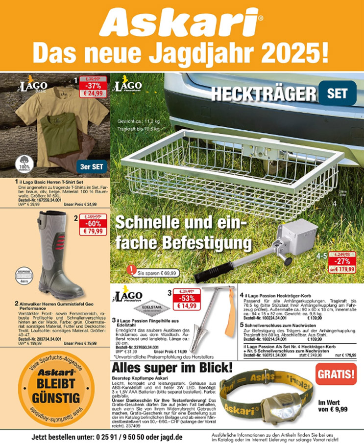 Jagdzubehör in hervorjagender Vielfalt finden Sie in unserem kostenlosen, etwa 280 Seiten starken Jagd-Katalog. Neben einem umfangreichen Angebot an Jagd- und Outdoor-Bekleidung bieten wir Ihnen alles, was das Jäger-Herz begehrt: von Rabenkrähen für die Lockjagd bis hin zu günstigen Hochsitzen für die Ansitz-Jagd.